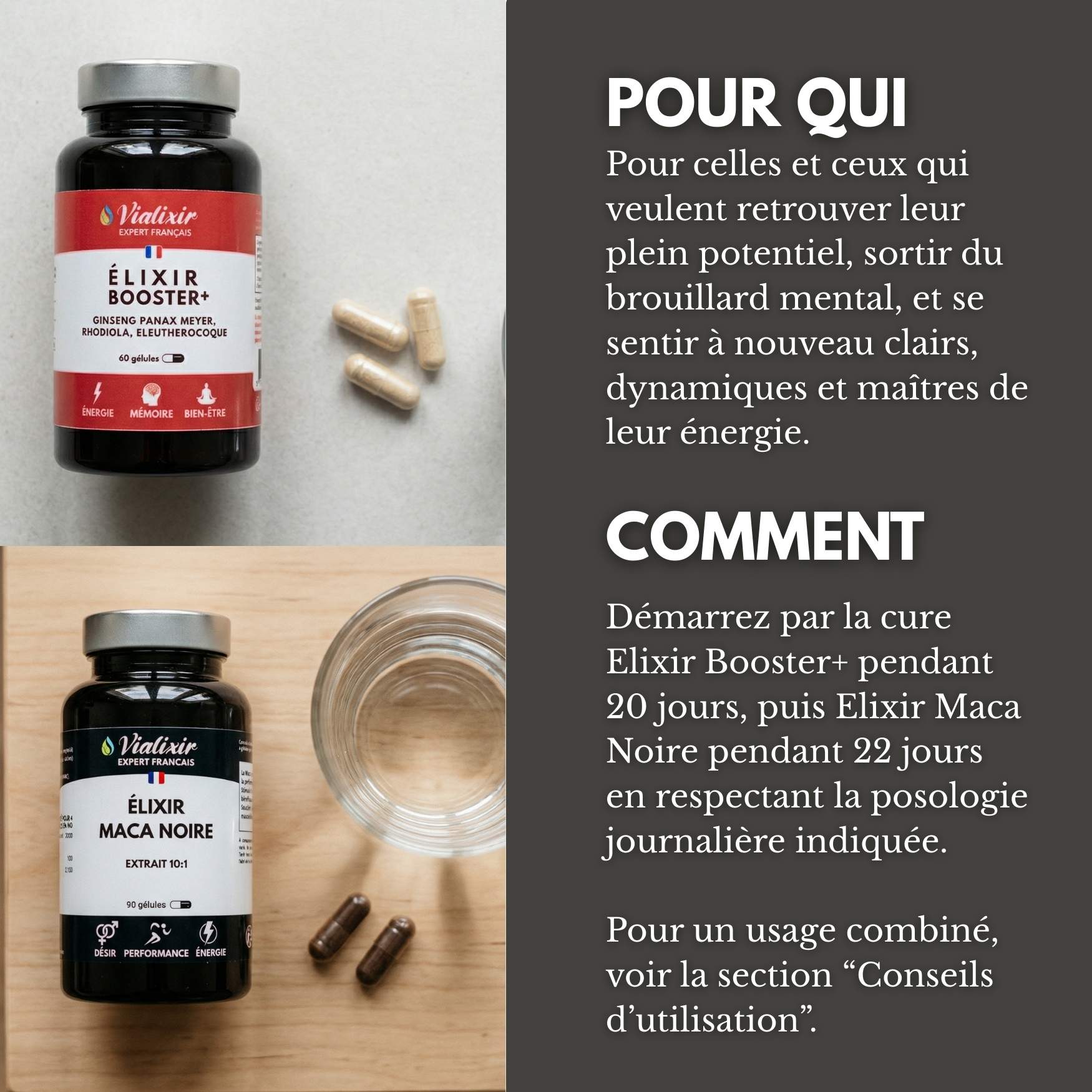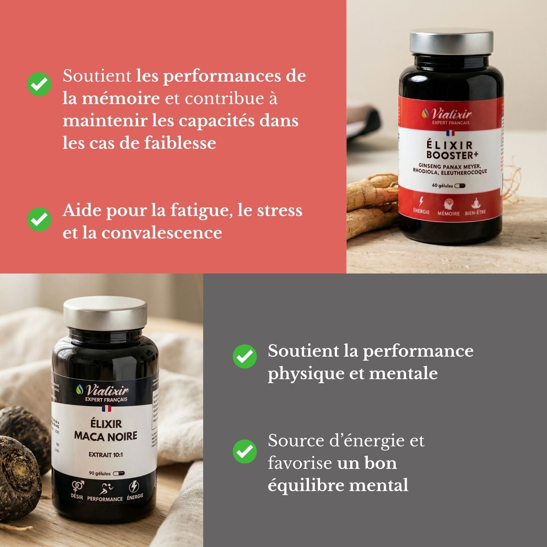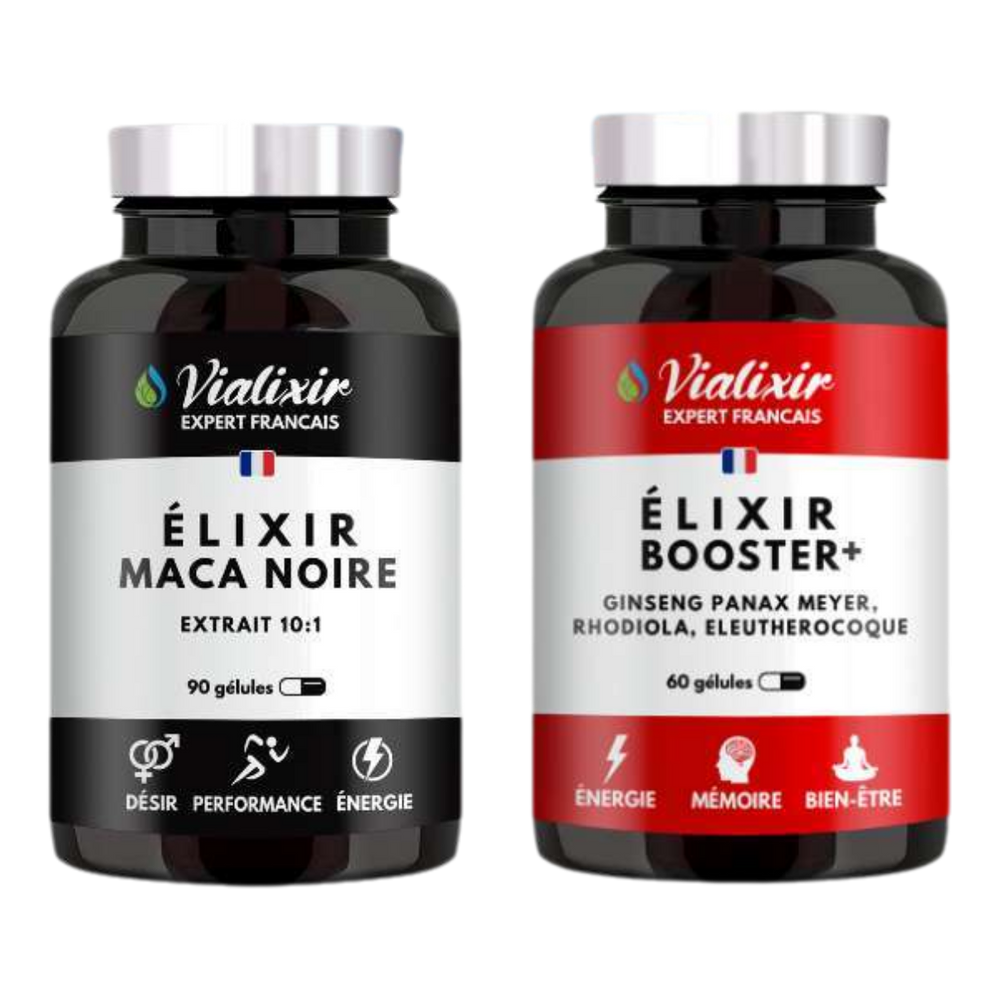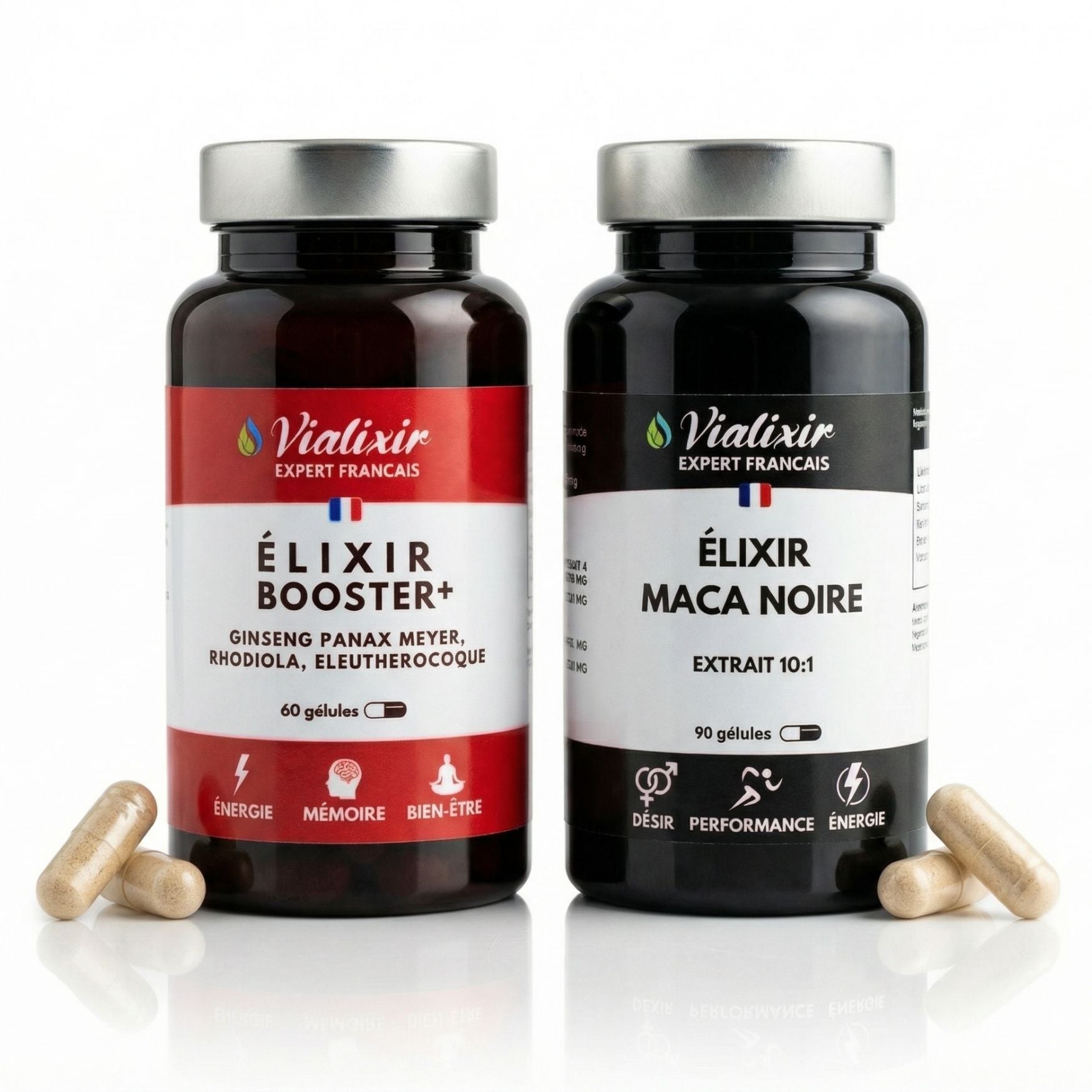 Chez Vialixir, nous ne croyons pas aux produits “coup de fouet” qui vous laissent sur les rotules deux heures plus tard. On a créé un pack intelligent, formulé avec soin, à base de plantes dont les effets sont connus et étudiés depuis longtemps.